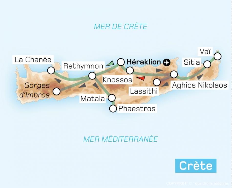 A ne pas manquer lors de votre trajet : le village de Fodélé, village natal du peintre El Gréco. Héraklion, le palais de Knossos.