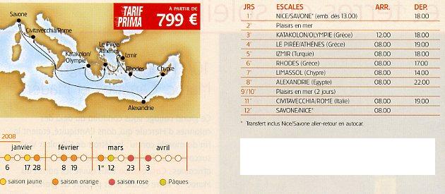 L'itinéraire de ces croisières uous offre de merveilleuses navigations touristiques. Sélectionnez votre observatoire idéal sur le navire et profitez de panoramas inédits; découvrez la terre depuis la mer... LE GOLFE D'AKROTIRI, l'entrée dans le port de Limassol, à Chypre. Non loin, le phare du Cap Gâta. LE DETROIT DE MESSINE, passage entre les côtes siciliennes et calabraises. L'ILE DE ZANTE,à environ une heure de navigation d'Olympie,vous pourrez admirer à tribord l'île de Zante depuis les ponts du Costa Concordia.