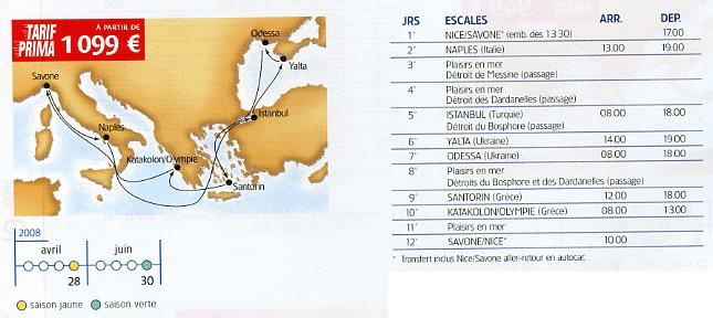 Croisières !!! Oubliez vos repères, larguez les amarres et quittez la terre ferme pour naviguer sur les océans et mers du monde. La croisière est un voyage dans le temps où on savoure chaque instant au rythme d'autrefois. Sans la contrainte de faire et refaire ses baggages, vous vous laissez transporter, confortablement installé dans votre cabine. Au rythme de la navigation, révez devant l'immensité qui vous enveloppe ou admirez les paysages qui défillent devant vous.. les heures ne comptent plus, la sensation de liberté est totale. La croisière, c'est aussi l'occasion de profiter de la vie à bord, de s'intitier à la navigation...La croisière, c'est enfin le découverte. Le temps d'une escale, vous abordez une nouvelle terre avec un regard neuf. Chaque croisière est une aventure