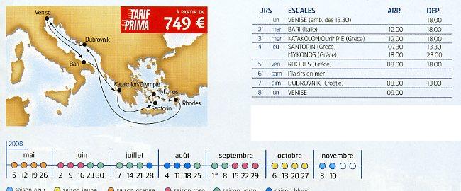 Croisières !!! Oubliez vos repères, larguez les amarres et quittez la terre ferme pour naviguer sur les océans et mers du monde. La croisière est un voyage dans le temps où on savoure chaque instant au rythme d'autrefois. Sans la contrainte de faire et refaire ses baggages, vous vous laissez transporter, confortablement installé dans votre cabine. Au rythme de la navigation, révez devant l'immensité qui vous enveloppe ou admirez les paysages qui défillent devant vous.. les heures ne comptent plus, la sensation de liberté est totale. La croisière, c'est aussi l'occasion de profiter de la vie à bord, de s'intitier à la navigation...La croisière, c'est enfin le découverte. Le temps d'une escale, vous abordez une nouvelle terre avec un regard neuf. Chaque croisière est une aventure