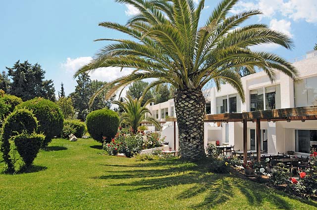 En bordure d’une plage (mi-sable, mi-galets), à 2 km d’Eretria, station estivale très appréciée, 22 km de Chalkis, capitale de l’île d’Eubée, 50 km d’Athènes (par le bac Oropos/Eretria) ou 110 km par Chalkis (env. 1 h 30 de transfert).
