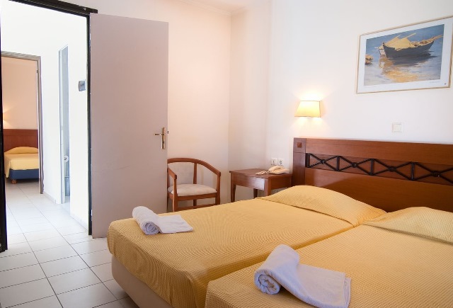 Chambres : décorées avec un gout raffiné, les chambres/studios de capacité de 3 personnes (1 chambre) disposent d’une kitchenette équipée (four micro-ondes, réfrigérateur, grille-pain), TV Satellite écran plat, wifi gratuit, climatisation (avec supplément 5 € / jour), téléphone et sèche-cheveux (sur demande à la réception), coffre-fort (10 € / semaine).