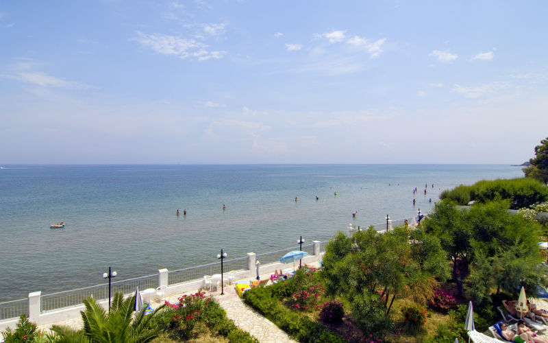 Directement sur la plage privée de sable et de petits galets, à 8 km de la ville de Zante (Zakynthos), à 12 km de l’aéroport. Arrêt de bus réguliers à 150 m.