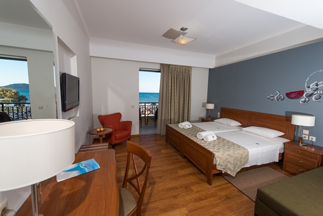 Il offre une vue exceptionnelle sur la célèbre plage de sable de Mavratzis qui se trouve à 80 m en contrebas de l’hôtel (accès direct par ascenseur).